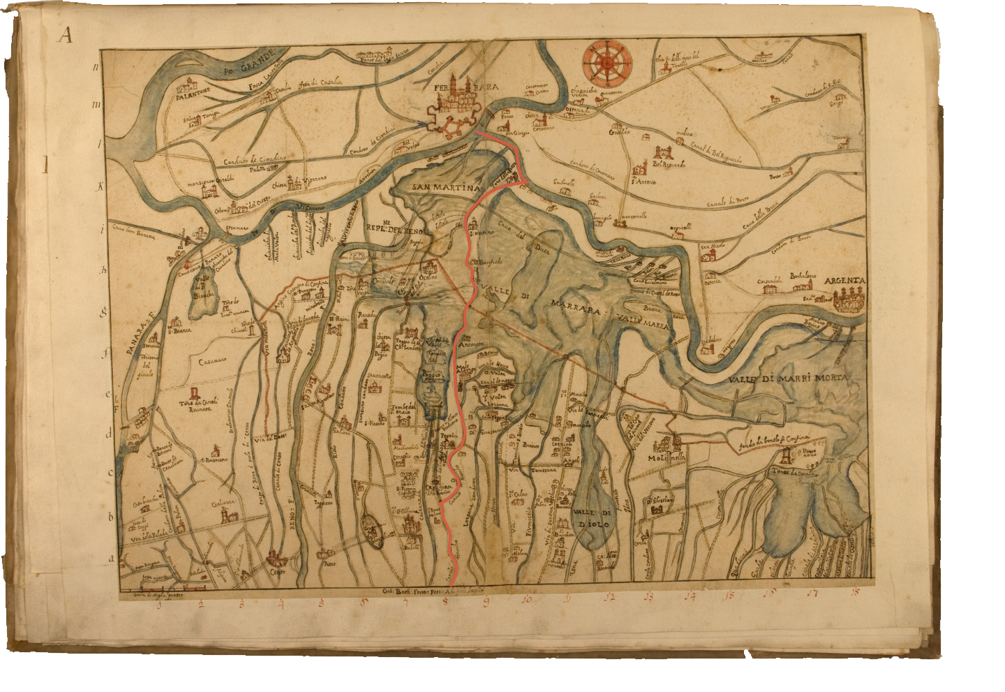 Da Bologna il Navile portava a Malalbergo, da dove, fino all’inizio del ‘600, si raggiungeva il Po di Primaro alla Torre della Fossa, attraversando le valli di Marrara e Sanmartina (come mostra la carta 2). Dopo l’interrimento della Sanmartina, iniziato con la deviazione del Reno nel 1604, non fu più possibile raggiungere Ferrara direttamente, ma solo con giri tortuosi come mostra la carta 3. Confrontando quest’ultima, realizzata nella seconda metà del ‘600, con la precedente, realizzata all’inizione del ‘600, si nota come, con il passare del tempo, le vie d’acqua mutassero il loro percorso.