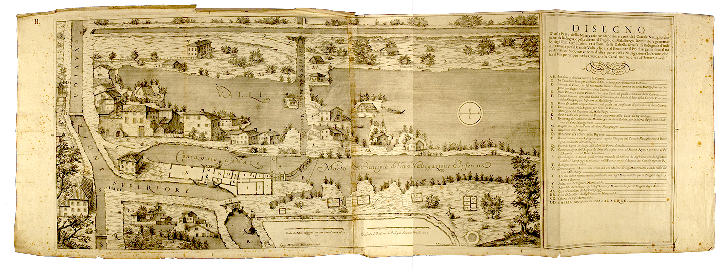 Per lunghi secoli l’arteria principale per il trasporto di merci da e per Bologna, che nel Medioevo era uno dei maggiori porti fluviali d’Italia, fu il Canale Navile (o Naviglio), che permetteva il transito anche a grossi burchi. Era, ed è, alimentato dalle acque del Canale di Reno del quale è, di fatto, la continuazione a nord della città. Il canale deve il nome e le sue acque al fiume Reno, da cui si origina alla Chiusa di Casalecchio di Reno, rappresentata in una bella stampa al n. 1. La chiusa fu costruita in epoca alto-medievale ed è un’imponente opera d’ingegneria idraulica: ha una larghezza di oltre 250 metri e, col canale e gli scolmatori, si sviluppa per oltre 2 km, interamente in muratura. Alcuni datano la sua costruzione a prima dell’anno 1000, altri al 1191. In ogni caso, a quell’epoca, era una delle maggiori chiuse d’Europa.