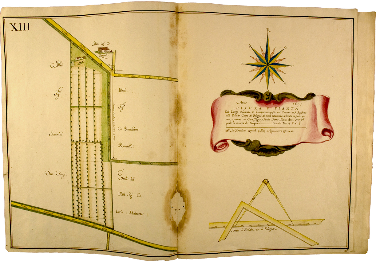 Con il XV secolo la zona di Mirabello andò gradualmente popolandosi: le carte ci mostrano campi ordinati (in particolare in sinistra Reno), divisi da cavedagne, coltivati con cura e con una dimora in ogni proprietà. L’aristocrazia urbana impose ben presto la propria autorità anche in questa zona, un tempo trascurata. Tra i primi casati che vi si insediarono vi furono i Malvezzi, bolognesi, che, nel 1487, acquisirono una vasta proprietà nella zona detta Spron. Il relativo atto è riprodotto al n. 1.
