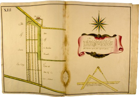 Presentiamo una scelta di documenti relativi alle loro proprietà, estesa sull’arco di tre secoli e, nella mappa verde al centro, abbiamo identificato la località a cui ciascuno di essi si riferisce con il numero che lo contraddistingue. In particolare ai mirabellesi divertirà sapere che il Chiesolino del Cinquanta, sulla Via Giovecca verso la Torre da Verga, che è visibile nella foto alla sinistra del pannello, mutua il nome da un limitrofo antico fondo dei Malvezzi detto le Cinquanta, la cui pianta è riprodotta al numero 5.