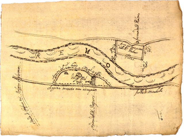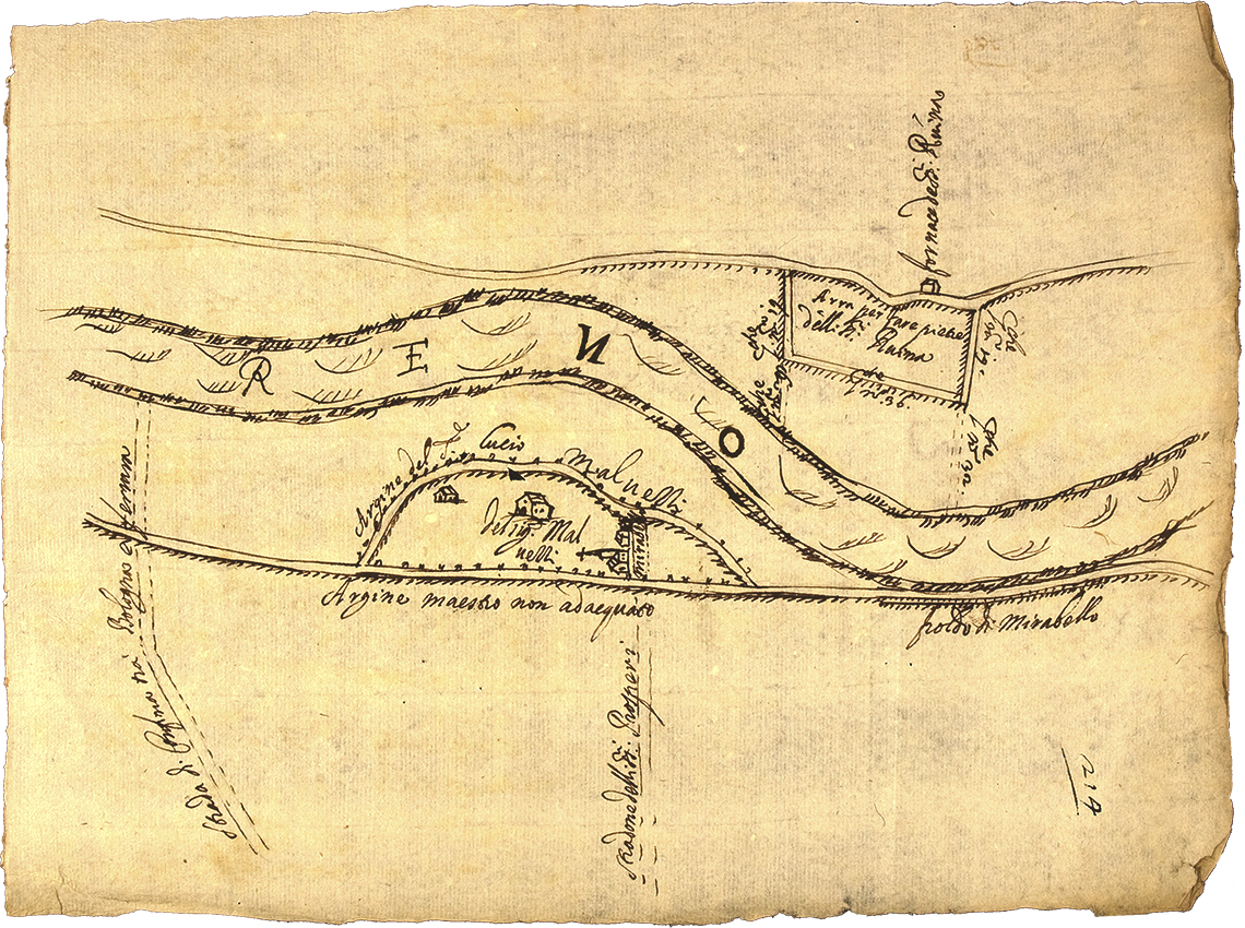 Il Ruini ha costruito una coronella [argine in curva], di rimpetto al froldo [argine] destro di Reno, sopra una Ghiara [ghiaia = golena], al fine di serrare un’arra [ara = aia] per fabbricarci sopra delle pietre [mattoni] per la fornace che ha dentro alli argini, che pur anco vi ha la sua arra per detto effetto. I Ferraresi temono che il rigurgito che essa provoca (innalza l’acqua e la stringe al collo al detto froldo) danneggi l’argine maestro. Parimenti dannoso giudicano l’argine che il Sig. Malvezzi ha realizzato subito a valle, accostato all’argine opposto per difendere una sua casa, fornace, orto e giardini … essendo debile … l’Argine maestro.