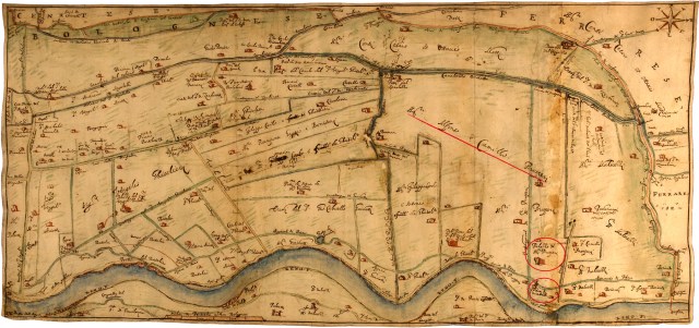 La grande carta al centro del pannello (documento 4) è un rilievo, databile al secondo decennio del 1600, delle proprietà in sponda sinistra di Reno, tra Sant’Agostino e Mirabello. Le proprietà dei Prosperi si estendono dal Reno allo Scolo Canalazzo. In prossimità del Reno sorge il loro Palazzo e l’Oratorio di San Bartolomeo, indicato come Chiesa di Mirabello. Più a destra sono le proprietà Malvezzi. E’ ben individuato anche il Palazzo Rosso dei Ghisilieri, verso San Carlo e, sulla riva opposta, il Palazzo dei Ruini, di cui parleremo nel prossimo pannello. Più a sinistra, un laghetto che la relazione associata alla carta (è riprodotta sotto di essa) descrive come il resto di una precedente rotta. Proprio nel 1620, i Prosperi diedero mandato all’agrimensore Vincenzo Sassi di Bologna di rilevare i loro beni posti a destra e a sinistra dell’attuale strada Mandini. Gli appunti e gli schizzi del rilievo sono riprodotti al numero 5.