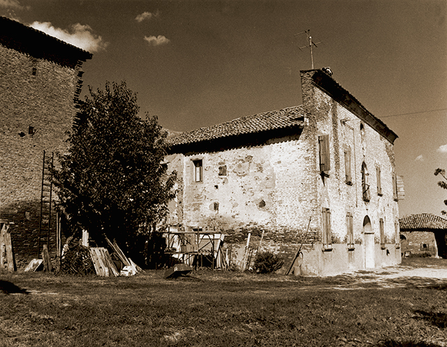 Ormai affermati e ricchi i Prosperi decisero di investire in una proprietà agraria a Mirabello. Non sappiamo quando gli acquisti iniziarono, ma fu certamente prima del 1541, data del primo atto pervenutoci: il documento 1. Col tempo estesero la loro proprietà (documento 2) e costruirono il notevole Palazzo che compare in varie viste nelle foto al centro e alla destra del pannello (purtroppo esso è oggi tanto in rovina da esser detto Villa Topi). Nei pressi del palazzo edificarono un oratorio, dedicato dapprima a San Giuliano e successivamente (dal 1552) a San Bartolomeo. Nel 1574 l’oratorio divenne chiesa sussidiaria di Sant’Agostino e fu così la prima chiesa di Mirabello. E’ ritratto nella foto sotto il pannello nero introduttivo, scattata nel 1918; davanti alla porta dell’oratorio si nota un’antica locomobile: un motore a vapore per azionare trebbie e seghe.