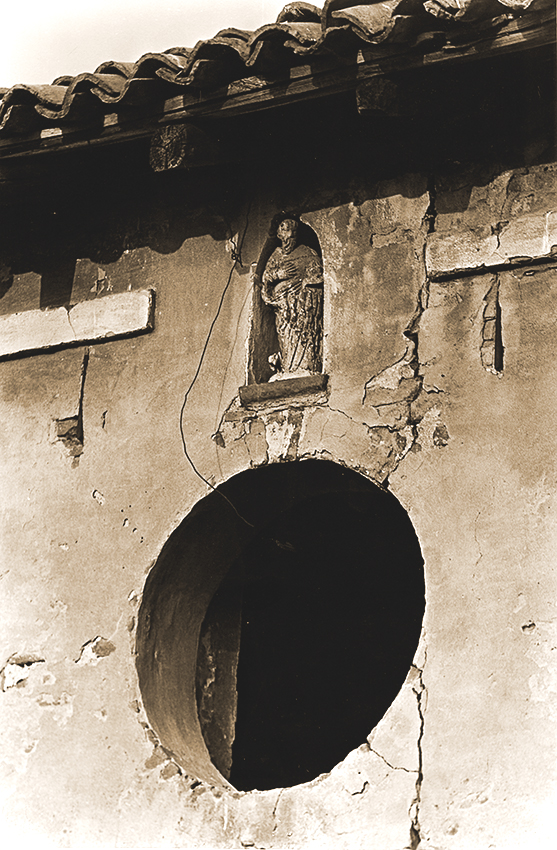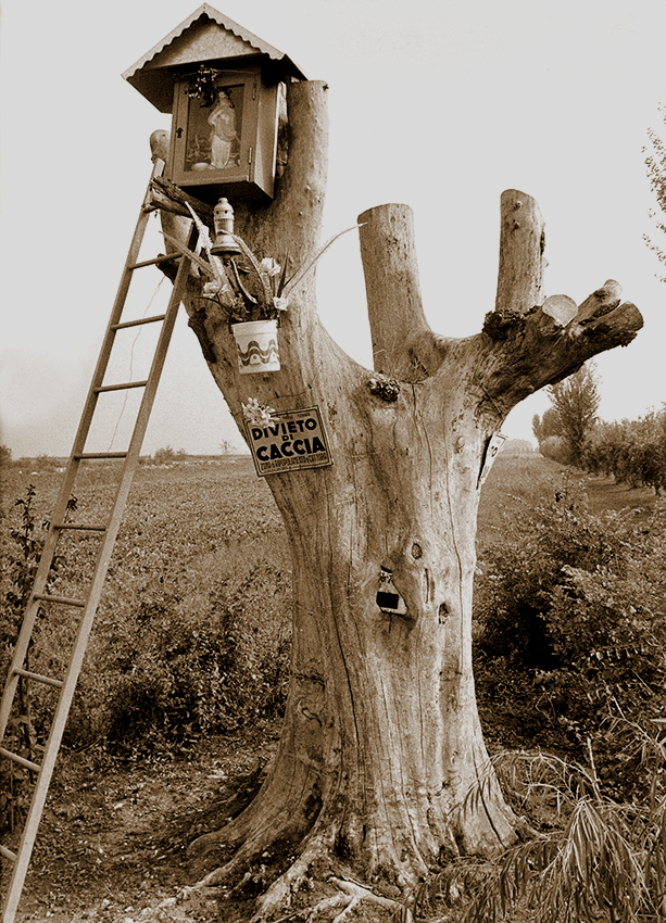 Provato da una vita di stenti, il popolo cercava conforto in una religiosità spesso primitiva, con qualche venatura di tradizioni paganeggianti, quale si conveniva a una gente sinceramente credente. La più spontanea, e più commovente, forma di tale religiosità si espresse a lungo in semplici croci, fatte di due rami a cui erano legate alcune foglie d’olivo. Ben presto comparvero le fioriere: umili offerte di tabernacoli di legno, per lo più dedicati alla Madonna, collocati su una pianta a protezione dei campi (l’Olma che presentiamo nella foto è stata abbattuta pochi giorni dopo che l’avevamo fotografata). I signori diedero seguito a questa usanza erigendo pilastrini e chiesuole, lungo le strade e all’ingresso delle loro possessioni, e, nell’800, dando spesso a queste ultime i nomi di santi protettori.